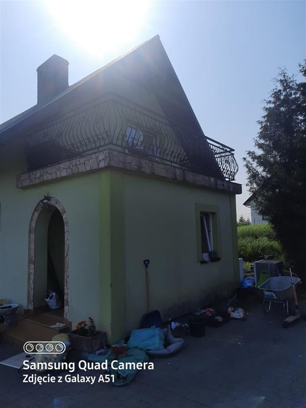 Budynek przyjęty do użytkowania na podstawie zawiadomienia z dnia 24.08.2011 r. posadowiony jest w centralnej części działki. Obiekt wzniesiony w technologii tradycyjnej, murowanej. Elewacja ocieplona, pokryta tynkiem z elementami kamienia ozdobnego. Dach o konstrukcji drewnianej, kryty blachą. Stolarka okienna PCV. Instalacje: wodna z sieci gminnej, elektryczna, c.o., kanalizacyjna (zbiornik szczelny, znajdujący się na działce).