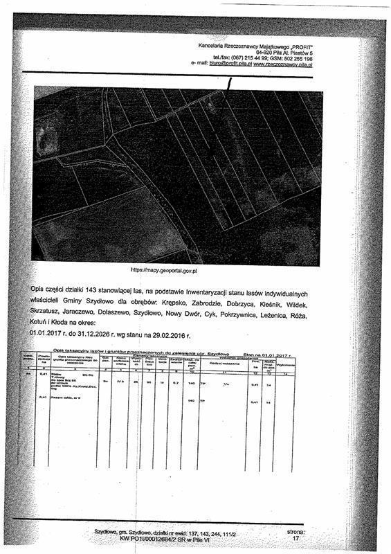 Przedmiotem licytacji jest udział wynoszący 1/2 części nieruchomości gruntowej niezabudowanej położonej pod adresem: SZYDŁOWO, 64-930 Szydłowo, dla której VI Wydział Ksiąg Wieczystych SR W Pile prowadzi księgę wieczystą o numerze PO1I/00012684/2. Działka nr. ew. 143 o pow. 2,6924 ha kształt reularny, działka posiada dostęp do drogi publicznej przez drogę publiczną -dojazd do działki drogą gruntową. Działka położona jest w bliskiej odległości od terenów rolnych i leśnych, w dalszej odległości zabudowa mieszkaniowa. Brak dostępu do sieci uzbrojenia. Teren częściowo płaski. Teren w części stanowiący las.
