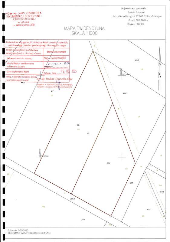Przedmiotem pierwszej licytacji jest niezabudowana nieruchomość gruntowa stanowiąca działki ewidencyjne o nr 168 oraz o nr 169 położonych w: 82-450 Stary Dzierzgoń, Myślice, dla których Sąd Rejonowy w Kwidzynie VIII Zamiejscowy Wydział Ksiąg Wieczystych z siedzibą w Sztumie prowadzi księgę wieczystą o numerze KW GD2I/00026002/4 w trybie uproszczonym. Niezabudowana nieruchomość gruntowa stanowi: - działkę ewidencyjną nr 168, powierzchnia 0,7700ha, klasa użytków rolnych ŁIII – są to grunty klasy dobrej, kształt regularny zbliżony do trapezu, ukształtowanie powierzchni równe, dojazd gminną drogą polną (bez utwardzenia). Odległość od drogi asfaltowej ok. 350m. - działka ewidencyjna nr 169, powierzchnia 0,6100ha, klasa użytków rolnych ŁIII – są to grunty klasy dobrej, kształt regularny zbliżony do trapezu, ukształtowanie powierzchni równe, dojazd gminną drogą polną (bez utwardzenia). Odległość od drogi asfaltowej ok. 310m.