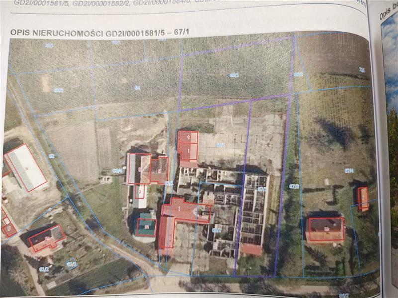 Nieruchomość gruntowa objęta księgą wieczystą nr GD2I/0001581/5 stanowi działki ewidencyjne nr 65/1 i 67/1 o powierzchni 0,4227 ha. Na działce nr 67/1 znajdują się pozostałości po budynku ubojni zniszczonej w wyniku pożaru. Budynek wybudowany w 2006 r. metodą tradycyjną murowaną z bloczków keramzytobetonowych wypełnionych styropianem typ MONOLIT 25, murowanych na zaprawie cementowo-wapiennej, ściany fundamentowe z bloczka betonowego na zaprawie cementowo-wapiennej, część budynku podpiwniczona. Obiekt stanowił funkcjonalną całość z pozostałą zabudową usytuowaną na sąsiednich nieruchomościach będących własnością dłużników. Działka nr 65/1 o powierzchni 0,2034 ha jest niezabudowana.