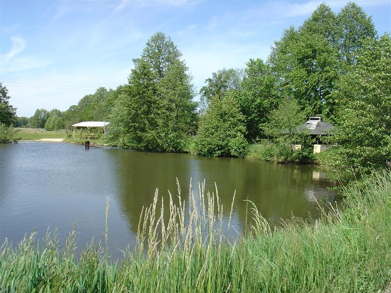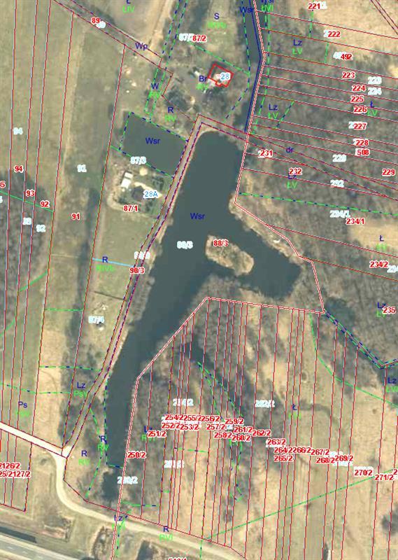 Działka zabudowana nr 87/3 - Użytki: RIVb - 0,3651 ha, RV- 0,0737 ha, ŁIV - 0,1531 ha, W-RV - 0,0221 ha, Wsr - 0,1491 ha. Razem powierzchnia działki – 0,7631 ha. Wymiary działki wynoszą: średnio 50 metrów szerokości i około 153 metrów szerokości. Działka dłuższym bokiem przylega od strony wschodniej do drogi publicznej. Teren działki płaski, wysoki poziom wód gruntowych. Grunt stabilny, piaszczysty. W północnej części działki użytki rolne, tereny zadarnione – pastwiska. Przy wschodniej granicy, wzdłuż drogi publicznej znajduje się staw rybny ze spiętrzeniem, groblą i mnichem przy północnej granicy stawu. Rów spustowy ze stawu przebiegający w kierunku północnym przez działkę. Zasilanie wodą przelewem, ze stawu sąsiedniego położonego po drugiej stronie drogi gminnej. W północnej części pojedyncze zadrzewienia i zakrzaczenia. Staw rybny o powierzchni 1491 mkw. Na północnej części działki stare wiaty i zadaszenia przy stawie. W centralnej części działki, w odległości około 20 m. od granicy stawu, posadowiony jest budynek mieszkalny, jednorodzinny. Budynek parterowy z poddaszem, niepodpiwniczony, wolnostojący. Płyta fundamentowa betonowa. Ściany konstrukcji drewnianej, od zewnątrz oszalowane deskami, od wewnątrz wykończone karton-gipsem i boazerią. Kominy murowane z cegły pełnej. Obok budynku od strony zachodniej ciąg blaszanych garaży (obiekty nie związane trwale z gruntem, nie będące przedmiotem wyceny). Dojazd i dojście do budynku oraz opaska wokół budynku utwardzona grubym, płukanym żwirem. Wokół budynku szpalery kilkunastoletnich tui oraz ozdobne nasadzenia świerków srebrzystych i krzewów ozdobnych
