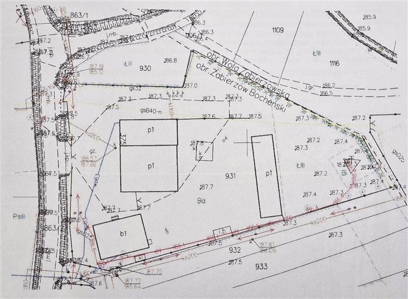 w miejscowości Zabierzów Bocheński nr 375, obręb 9, gmina Niepołomice, powiat wielicki, zabudowanej budynkiem biurowym (budynek parterowy, w zabudowie wolnostojącej) oraz trzema halami magazynowymi (hale parterowe, dwie w zabudowie przyległej i jedna w zabudowie wolnostojącej, budynek oznaczony w ewidencji jako biurowy aktualnie wykorzystywany przez właściciela nieruchomości do własnych celów mieszkaniowych) o łącznej powierzchni użytkowej budynków 925,52m2, we wschodniej części działki usytuowany słup telekomunikacyjny anten nadawczych GSM Play, postawiony 2022 r. Dla działki nr 931 obowiązuje miejscowy plan zagospodarowania przestrzennego zatwierdzony Uchwałą nr LXIX/728/10 Rady Miejskiej w Niepołomicach z dnia 21 września 2010 r. w sprawie uchwalenia miejscowego planu zagospodarowania przestrzennego Gminy Niepołomice dla obszaru „Zabierzów Bocheński I” wraz z późniejszymi zmianami, zgodnie z którym działka położona jest: w większości w Terenach zabudowy produkcyjnej i zabudowy usługowej ozn. P/U, północno – wschodnia część w Terenach rolniczych ozn. R, a zachodni fragment działki w terenach dróg publicznych ozn. KD/Z., stanowiącej własność dłużnika: