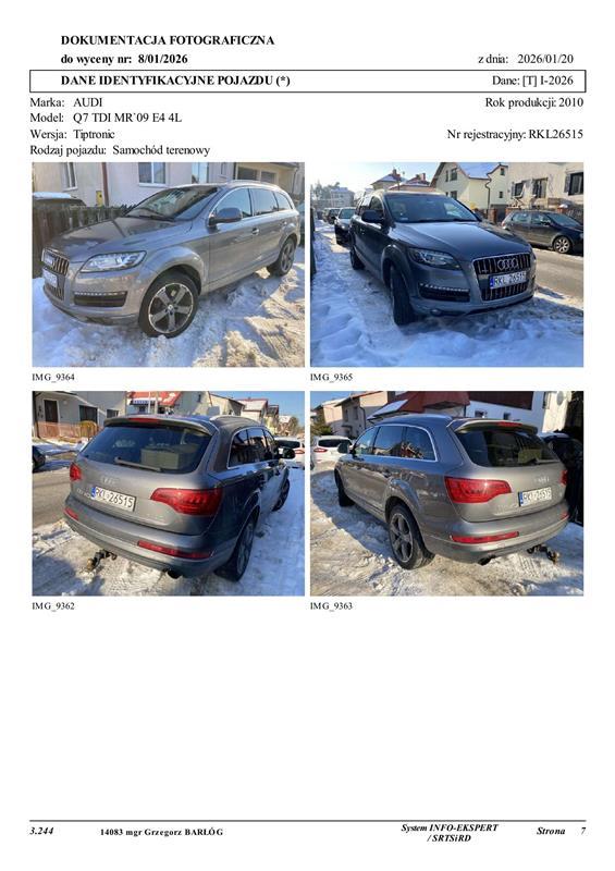 | 4 | AUDI Q7, nr rej. RKL26515, VIN: WA1LMAFE5BD001564, rok produkcji 2010, data nast. bad. 03.09.2025 | 1 | 26 100,00 zł 21219,51 zł netto + 23% VAT | 19 575,00 zł* |