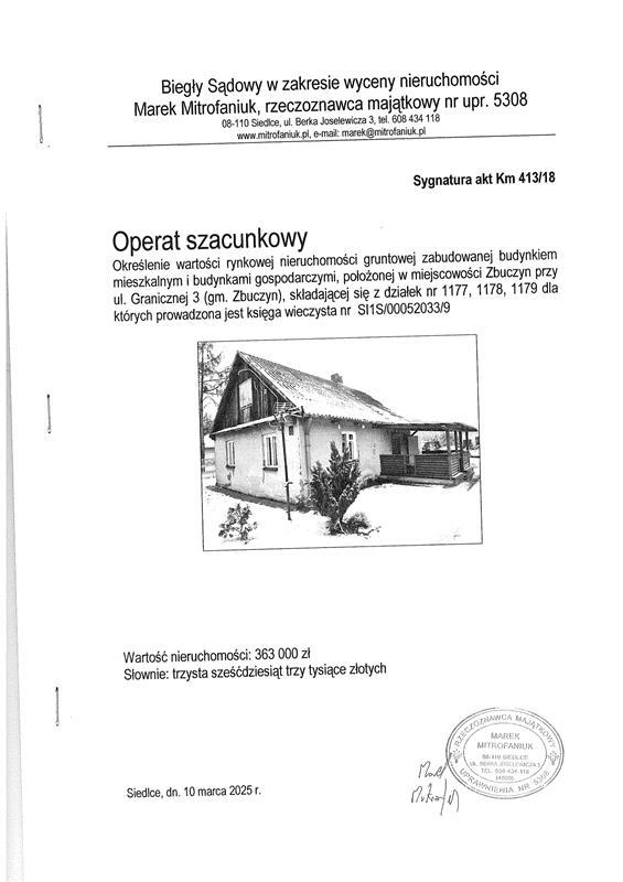 - nieruchomości, której właścicielem jest Sławomir Szaniawski położonej przy Graniczna 3, 08-106 Zbuczyn, dla której Sąd Rejonowy w Siedlcach VI Wydział Ksiąg Wieczystych (adres: ul. Kazimierzowska 31A, Siedlce, 08-110 Siedlce) prowadzi księgę wieczystą o numerze SI1S/0052033/9.