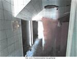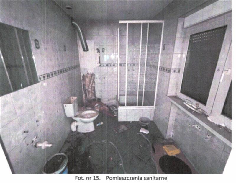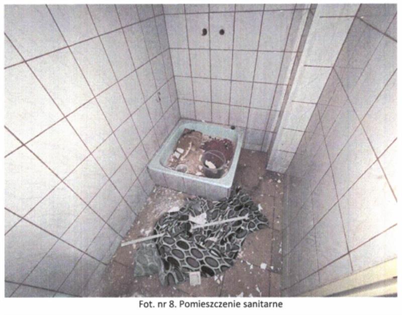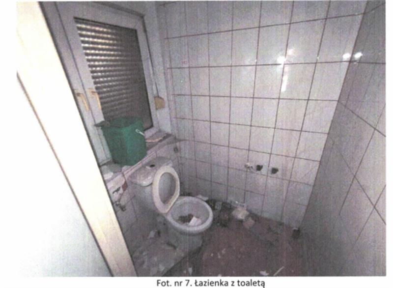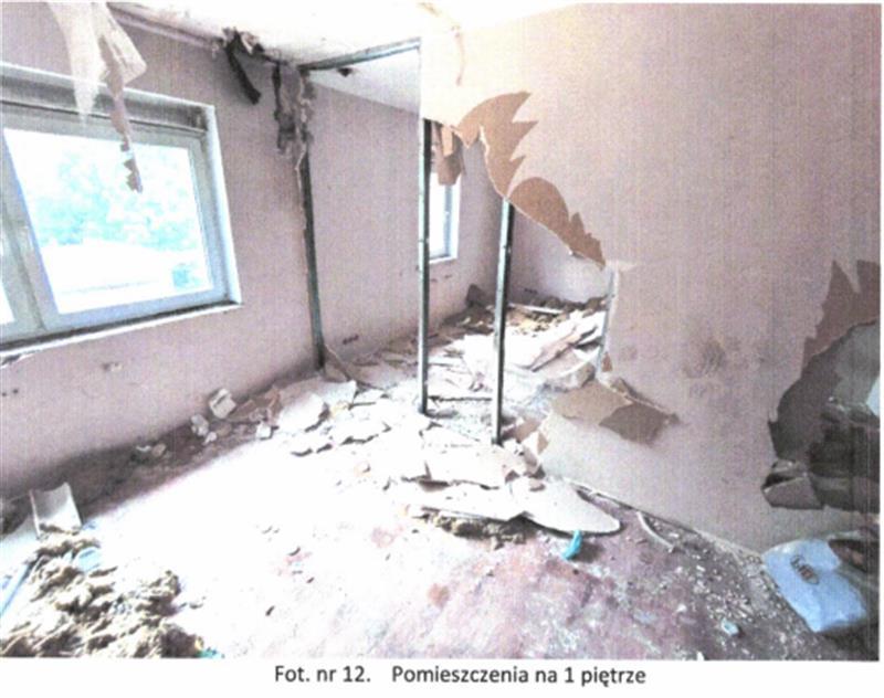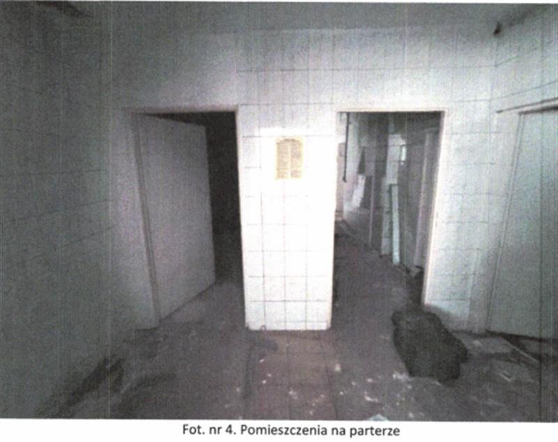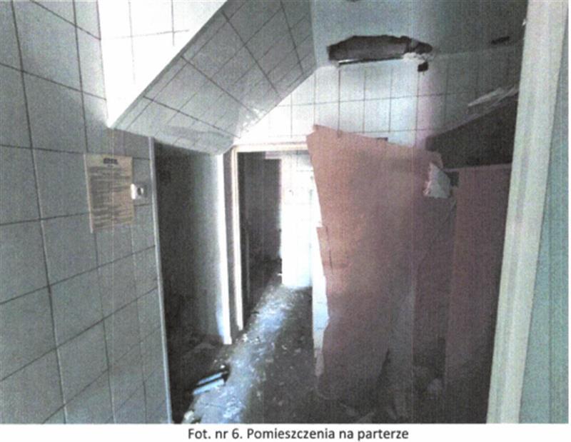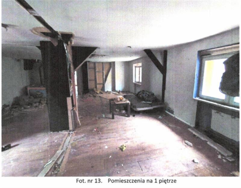 Układ funkcjonalny: na parterze znajduje się wiatrołap oraz pomieszczenia magazynowe zaplecza kuchennego, a także pomieszczenia sanitarne. Na I piętrze znajdują się dwa pomieszczenia usługowe oraz zaplecze sanitarne (wc i łazienka). Stan techniczny budynku dobry i standard wykończenia oceniona na niski. Obiekt nieużytkowany, wnętrza częściowo zdewastowane (pozrywane podwieszane sufity, częściowo usunięte instalacje elektryczne, uszkodzona instalacja CO-brak grzejników i armatury).