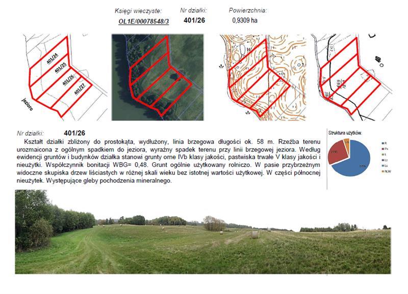 Przedmiotem licytacji jest nieruchomość gruntowa, położona w woj. warmińsko-mazurskim, powiecie ełckim, jednostce ewidencyjnej Stare Juchy, obrębie Grabnik, w zakresie prawa własności działki gruntu nr 401/26 o pow. 0,9309 ha z linią brzegową jeziora Rogale ok. 58m, opisanej w KW OL1E/00078548/3 wraz z udziałem 1/42 części w działkach gruntu nr 401/37 i 401/38 o łącznej. pow. 0,8384 ha jako udział w drodze wewnętrznej, opisanych w KW OL1E/00053060/7.