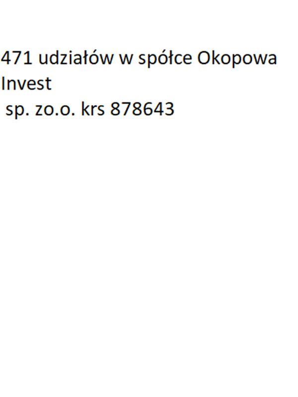 | 1 | 471 udziałów w spółce Okopowa Invest sp. zo.o. krs 878643 | 14 149,79 zł | 7 074,90 zł | 354,00 zł |