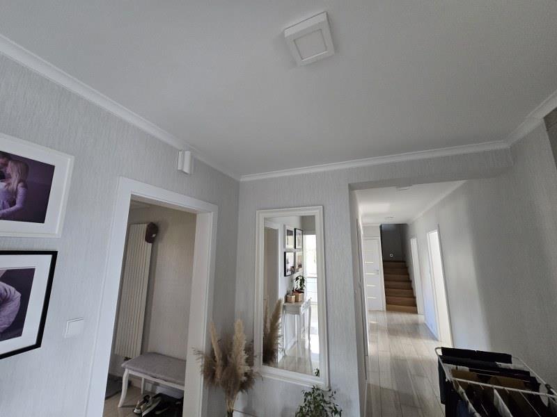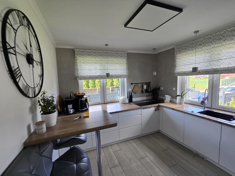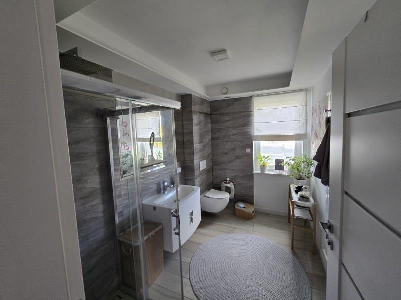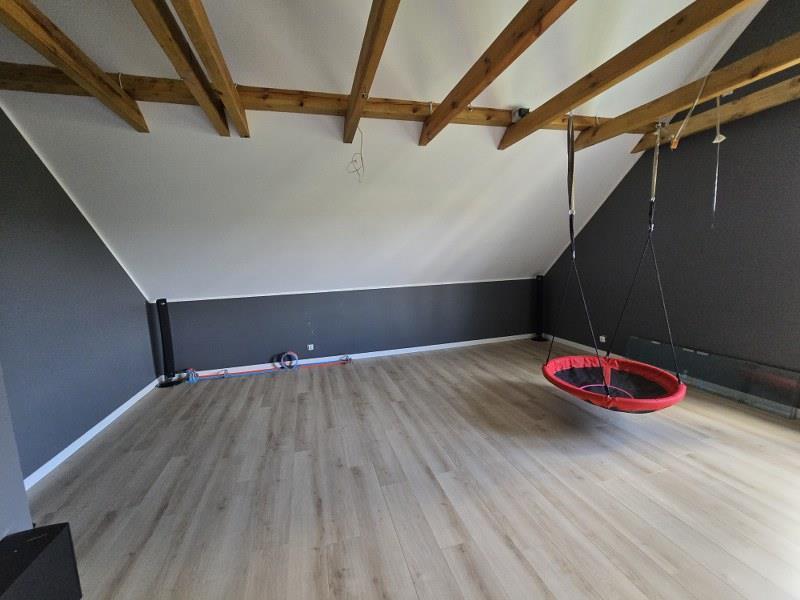 korytarz z klatką schodową, wejście, garaż. W budynku na poddaszu: trzy pokoje, łazienka,