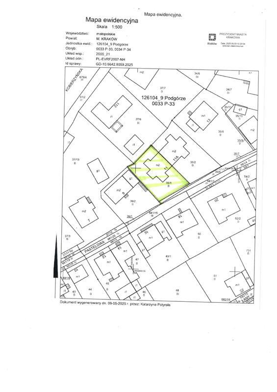 Działka zabudowana nr 35/1 położona w Krakowie, obręb 33 Podgórze o powierzchni 0,0429 ha, dla której SĄD REJONOWY DLA KRAKOWA - PODGÓRZA W KRAKOWIE IV WYDZIAŁ KSIĄG WIECZYSTYCH prowadzi księgę wieczystą KR1P/00094149/6. Nieruchomość położona jest w Krakowie, przy ulicy Pastelowej, w pobliżu skrzyżowania z ulicą Kobierzyńską, w odległości około 5,3 km od ścisłego centrum miasta – Rynku Głównego. W bezpośrednim sąsiedztwie nieruchomości znajdują się tereny zabudowy mieszkaniowej jednorodzinnej, w pobliżu także zabudowa wielorodzinna, usługowa oraz towarzysząca jej infrastruktura. Dostępność komunikacyjna bardzo dobra. Teren działki o kształcie regularnym, zabudowany i zagospodarowany. Działka posiada bezpośredni dostęp do drogi. Dojazd drogą asfaltową - ul. Pastelowa. Zgodnie z Uchwałą Nr LXXI/1989/21 Rady Miasta Krakowa z dn. 3 listopada 2021 r. dot. uchwalenia MPZP nieruchomość znajduje się w obszarze oznaczonym jako MNi/MWn t.j. tereny zabudowy mieszkaniowej jednorodzinnej istniejącej i wielorodzinnej niskiej intensywności oraz niewielki fragment komunikacja. Na działce posadowiony jest budynek mieszkalny oznaczony nr 11, teren ogrodzony. Dostęp do infrastruktury technicznej: sieć energetyczna, wodna, gazowa, kanalizacyjna.