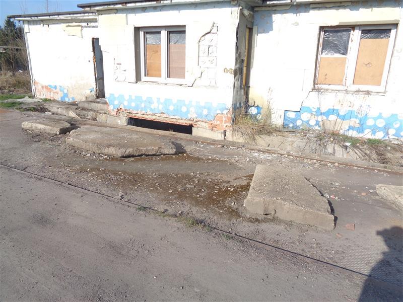 Budynek administracyjny wolnostojący, niepodpiwniczony, wykonany w technologii tradycyjnej murowanej, przykryty płaskim dachem. Budynek w bardzo złym stanie technicznym i ze względów bezpieczeństwa należy chronić go przed dostępem osób niepowołanych. Widoczne są duże uszkodzenia wszystkich elementów oraz bardzo duże zużycie eksploatacyjne. Istnieje poważne zagrożenie dla elementów konstrukcji ścian i dachów. Obiekt nie może być użytkowany zgodnie z przeznaczeniem, a jego remont nie jest uzasadniony technicznie ani ekonomicznie. Powierzchnia zabudowy budynku wynosi 71 m2