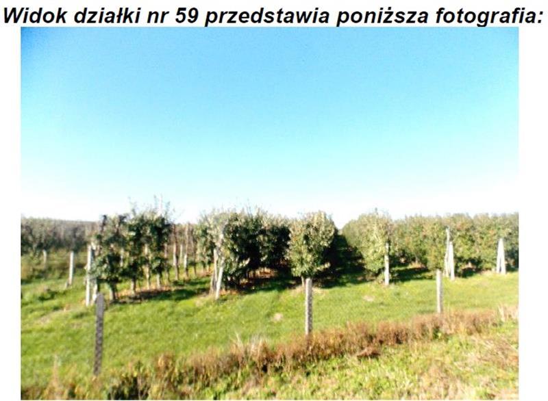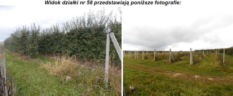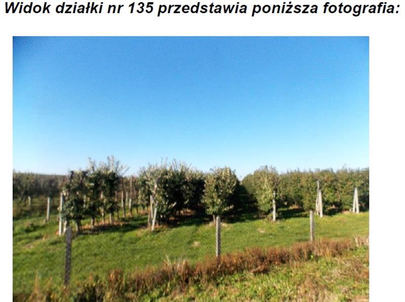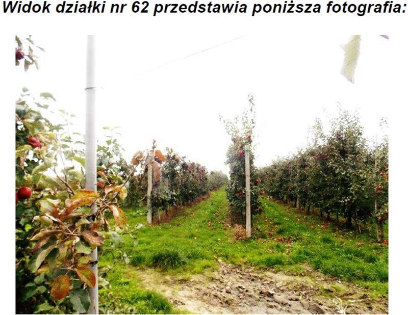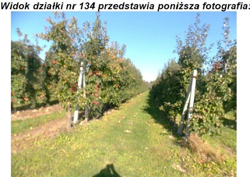 Działki położone są obok siebie, kształt jest nieforemny. Pozostała część działek stanowi sad jabłoniowy. Sad jest ogrodzony i nawadniany. Odmiana jabłoni: Najdared, Golden Delicious, Ligol, Jonaprince i Homeklins. Działka pod zabudową gospodarczą utwardzona jest kostką betonową na powierzchni 200 m2. Nieruchomość wyposażona jest w infrastrukturę techniczną: wodę, energię elektryczną i własny zbiornik bezodpływowy. Dojazd do nieruchomości stanowi droga utwardzona asfaltem. Przeznaczenie w miejscowym planie zagospodarowania przestrzennego: Rolnictwo z zabudową zagrodową ( symbol 34.04.RM ).